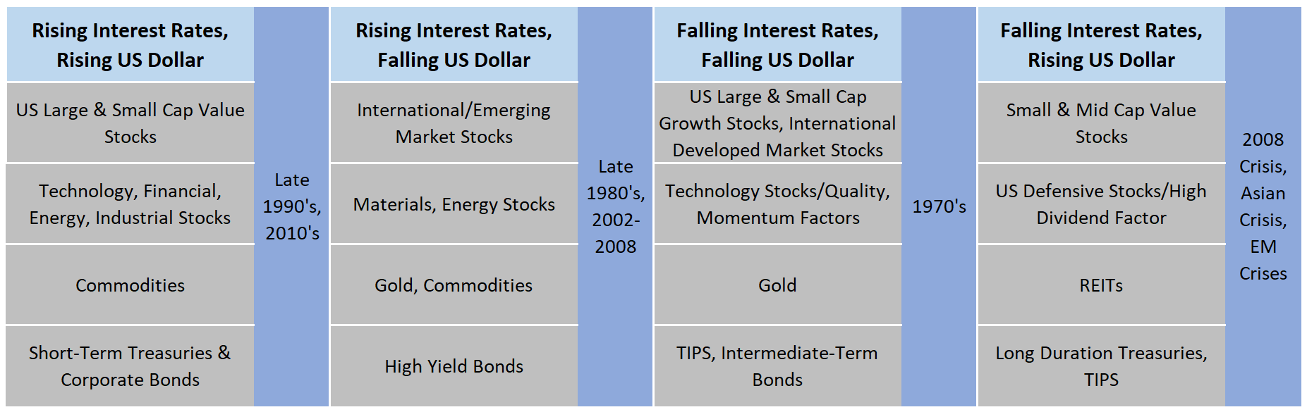 Based on extensive historical research, we identify assets that perform well in each of four economic environments: